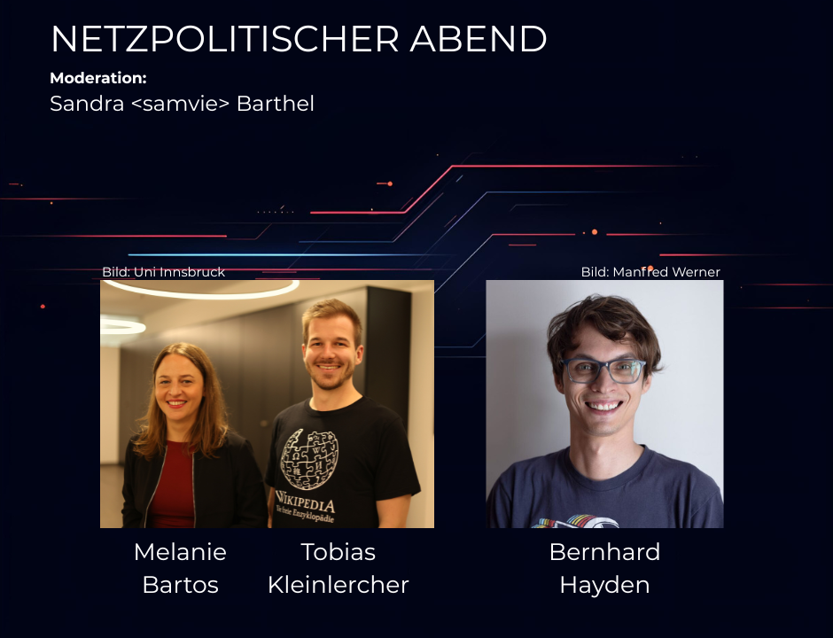 FREIRAD strahlt am 24.10. um 20 Uhr den den Netzpolitische Abend vom 17.10. aus, der im Stadtteiltreff Wilten statt fand. Angesichts der multiplen Krisen unserer Zeit teilen die Gäst*innen in Kurzvorträgen ihre Gedanken rund um die Frage, welche Rolle Freies Wissen in diesen Krisen spielen kann.
